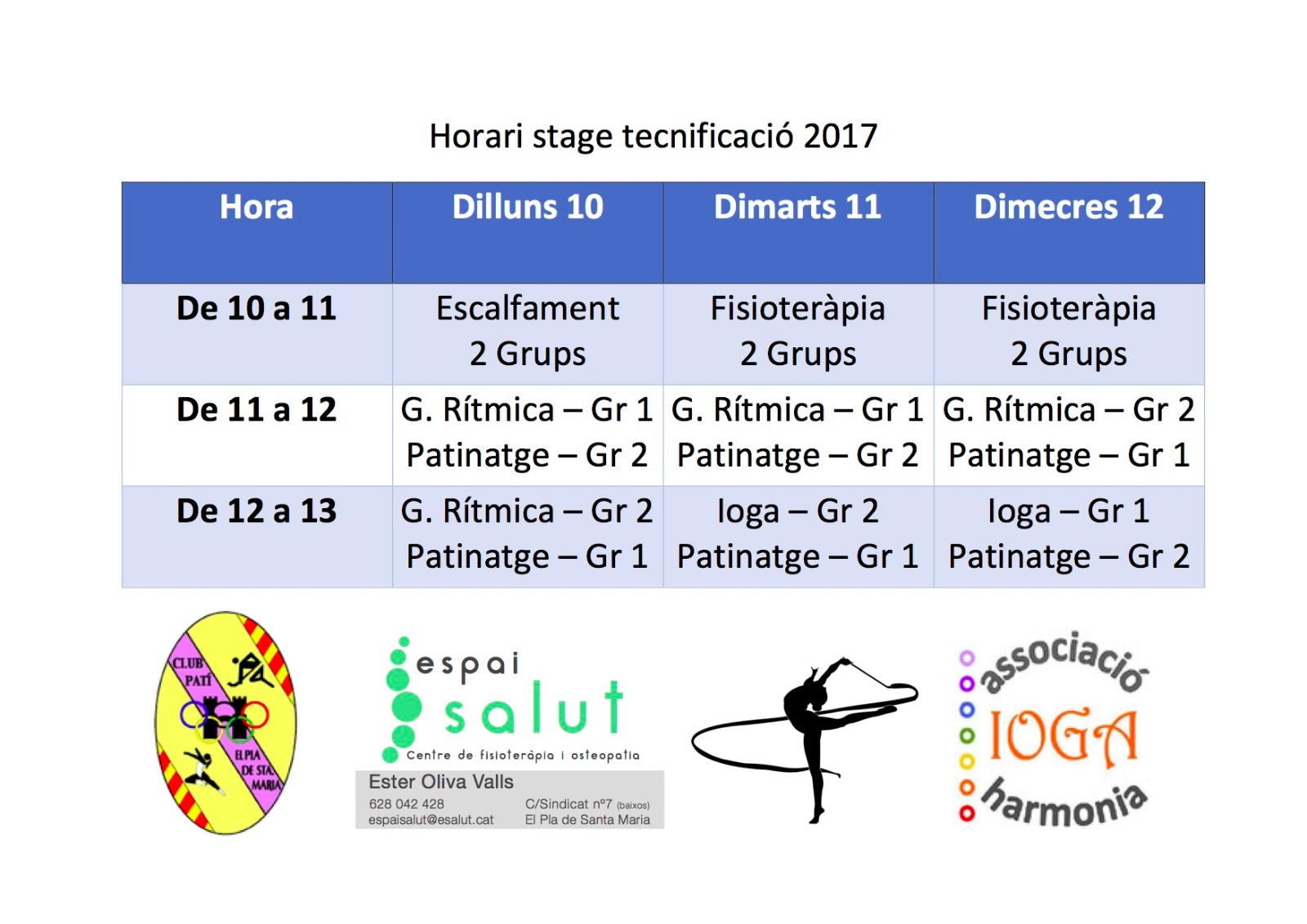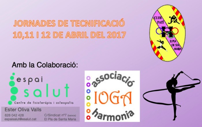 Aquest any per setmana santa hem decidit fer unes jornades de tecnificació per les nostres patinadores. Aquestes incorporen varies disciplines desde la fisioteràpia, dansa, gimnàstica rítmica, ioga i altres. També es faran activitats de patinatge com figures obligatòries, passos de dansa i tecnificació.