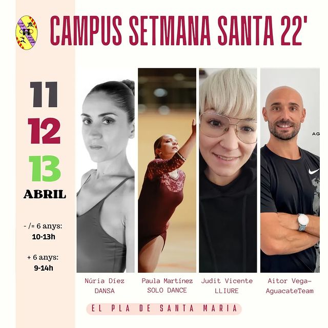 bonesss, boneees!!avui us portem el Campus Tecnificació Setmana Santa 22'🗓️ 11, 12 i 13 d'abril📍 Pavelló Municipal del Pla de Santa Maria🕐l'horari serà segons edat/nivell-/= 6 anys serà de 10-13h+ 6 anys de 9-14hComptarem novament amb:Dansa: NÚRIA DÍEZSolo Dance: PAULA MARTÍNEZLliure: JUDIT VICENTE - entrenadora de Nivell 3-Preparació Física: AGUACATE TEAMPer més informació poseu-vos en … Continua la lectura de Campus Setmana Santa