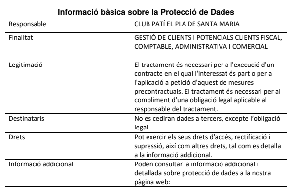 En CLUB PATÍ EL PLA DE SANTA MARIA li hem sol·licitat que ens comuniqui alguna de les seves dades personals per poder donar curs a la relació que mantenim les dues parts, i per poder realitzar altres tasques relacionades. Tal com estableix el Reglament General de Protecció de Dades, des de la nostra entitat li oferim la següent informació detallada sobre la nostra Política de Privacitat i Protecció de Dades: